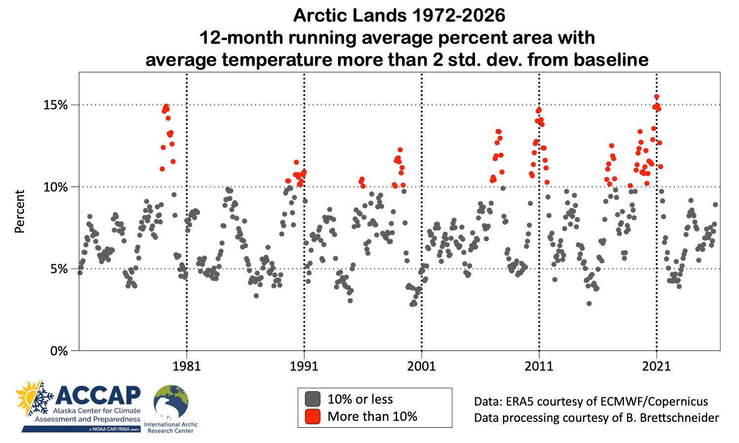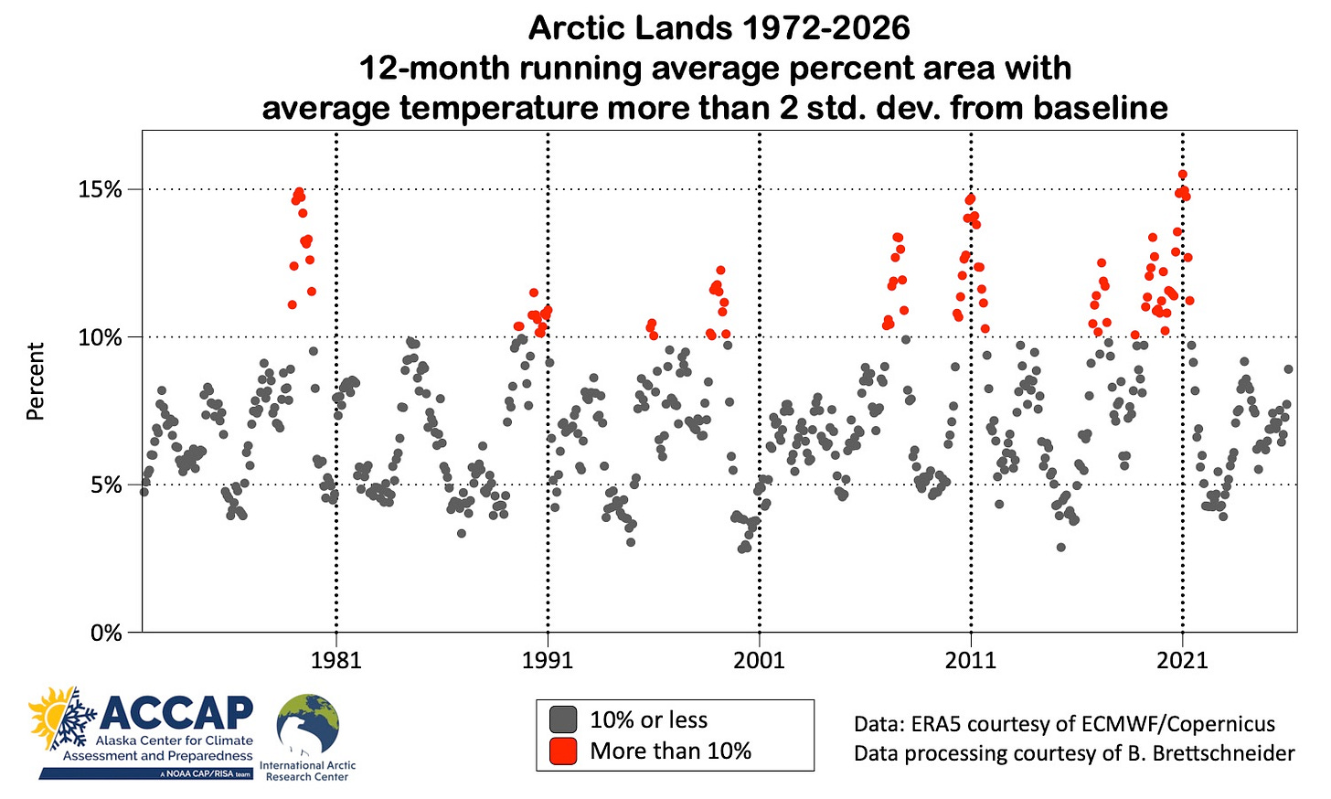This effect is evident in Fig. 6, which plots the 12-month running average of the area of Arctic lands more than two standard deviations from the applicable baseline. Notice that all the extended excursions in the running average above 10 percent of the Arctic lands occur in the second half of the decades, i.e. shortly before the new 30-year baseline takes effect, i.e. 1981, 1991, etc. Also, there is a sharp drop-off in high areal values right at the start of the new baseline period in 1991, 2011 and 2021.