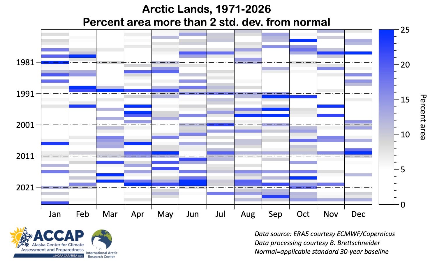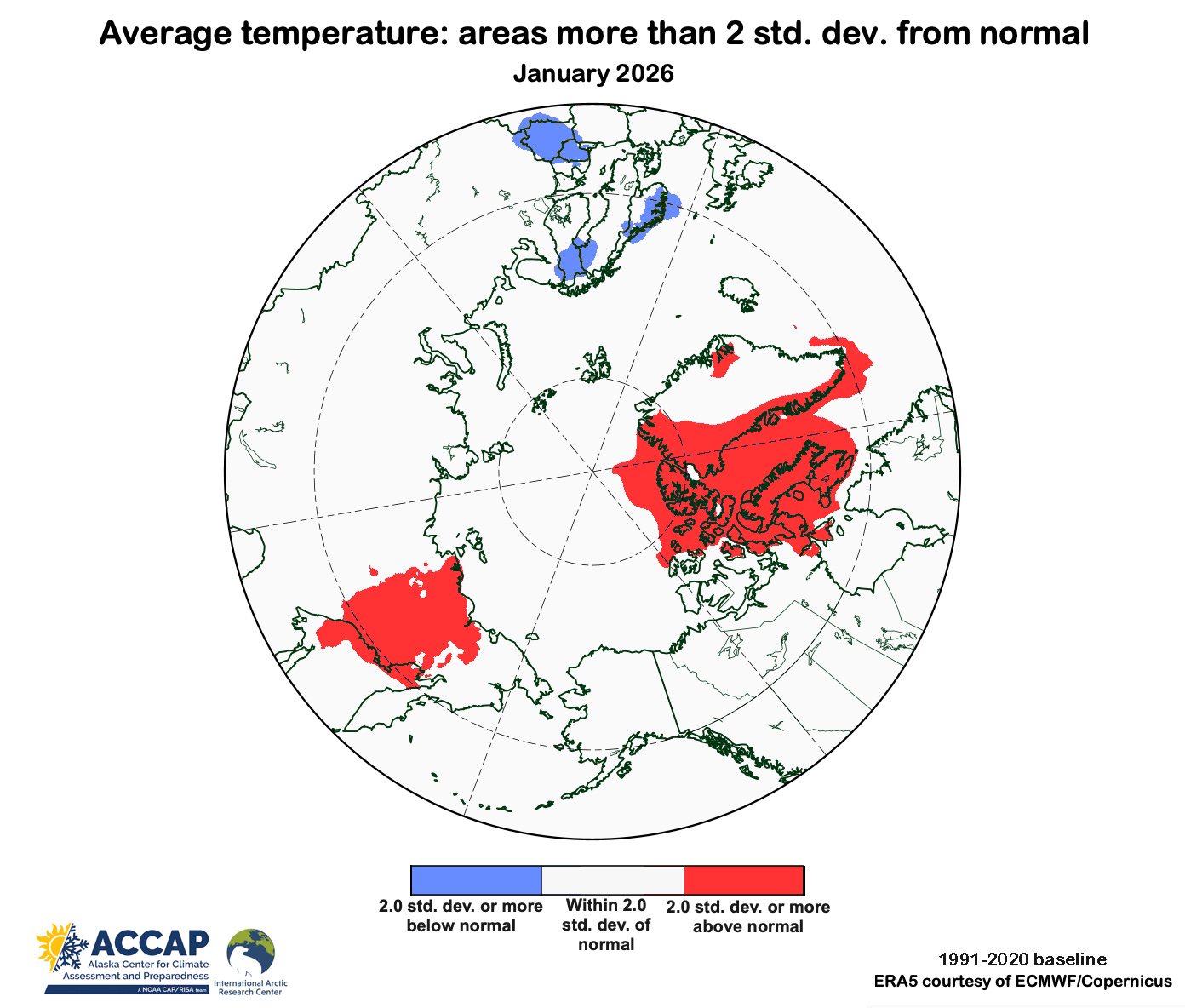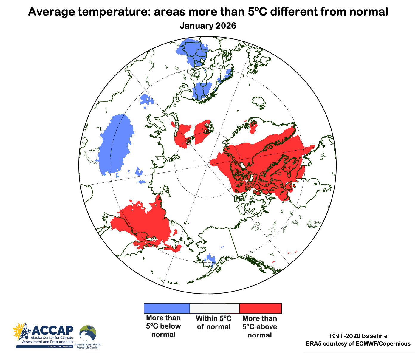 In the January 2026 climate summary I mentioned that almost a third of Arctic lands (land poleward of 60°N) had average temperatures that were more than 5°C different (higher or lower) than the 1991-2020 baseline average in the ERA5 reanalysis. Most of that occurred in western Greenland and eastern Nunavut, Canada and far eastern Russia, where January average temperatures were more than 5°C above the baseline average, but there were also smaller areas that were more than 5°C below the baseline in the northern Nordic Arctic, south-central Siberia and southwest Alaska (Fig. 1). When I wrote that, I thought that seemed like a lot, but it was just an impression.