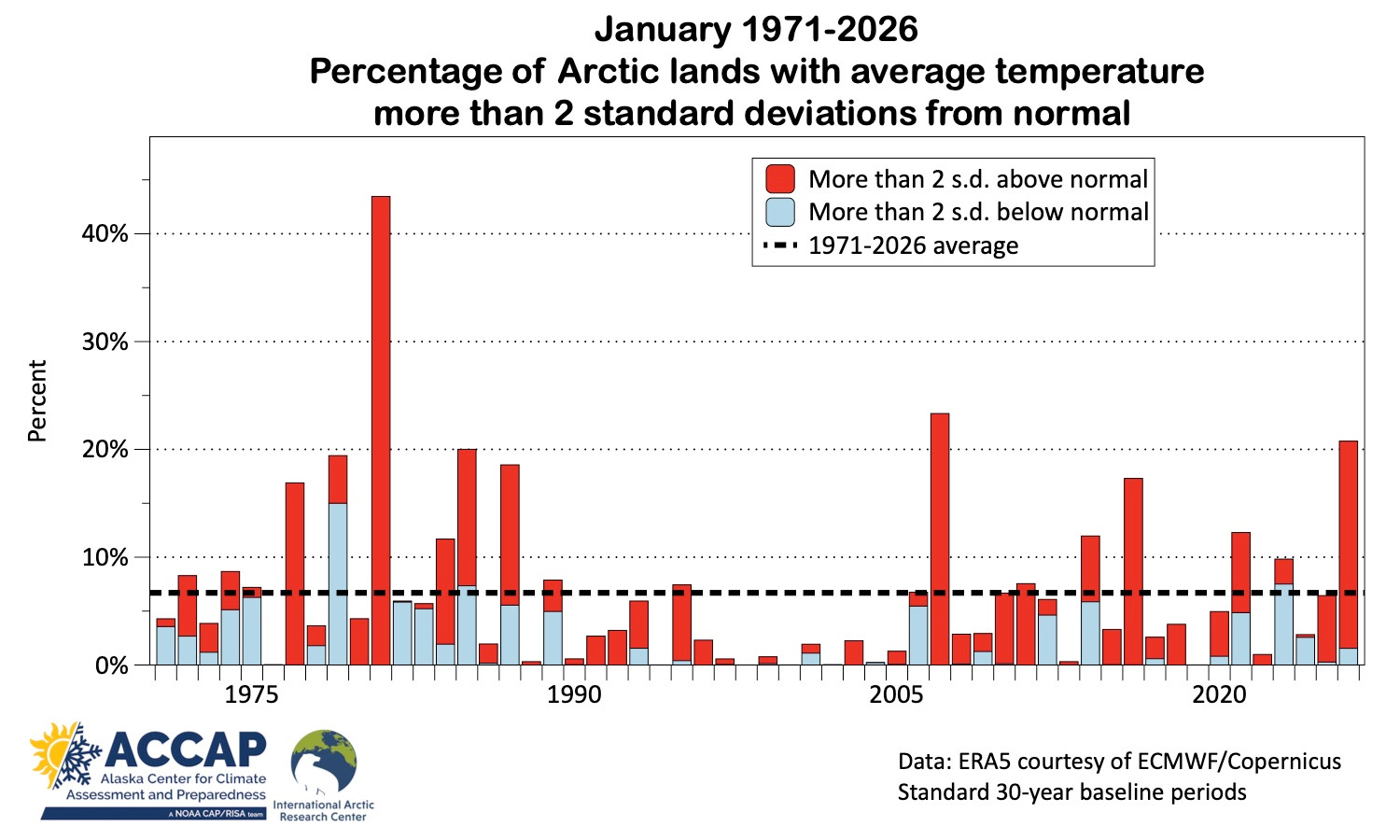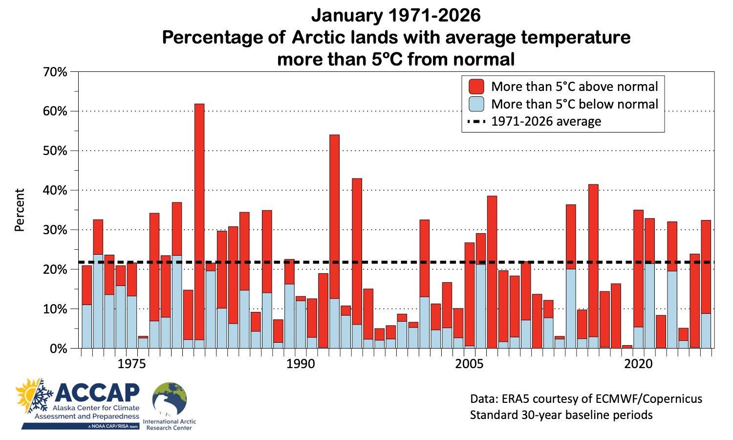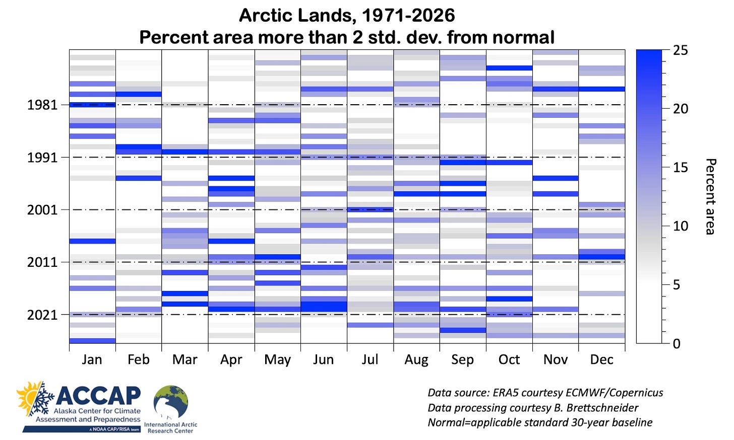 In the January 2026 climate summary I mentioned that almost a third of Arctic lands (land poleward of 60°N) had average temperatures that were more than 5°C different (higher or lower) than the 1991-2020 baseline average in the ERA5 reanalysis. Most of that occurred in western Greenland and eastern Nunavut, Canada and far eastern Russia, where January average temperatures were more than 5°C above the baseline average, but there were also smaller areas that were more than 5°C below the baseline in the northern Nordic Arctic, south-central Siberia and southwest Alaska (Fig. 1). When I wrote that, I thought that seemed like a lot, but it was just an impression.